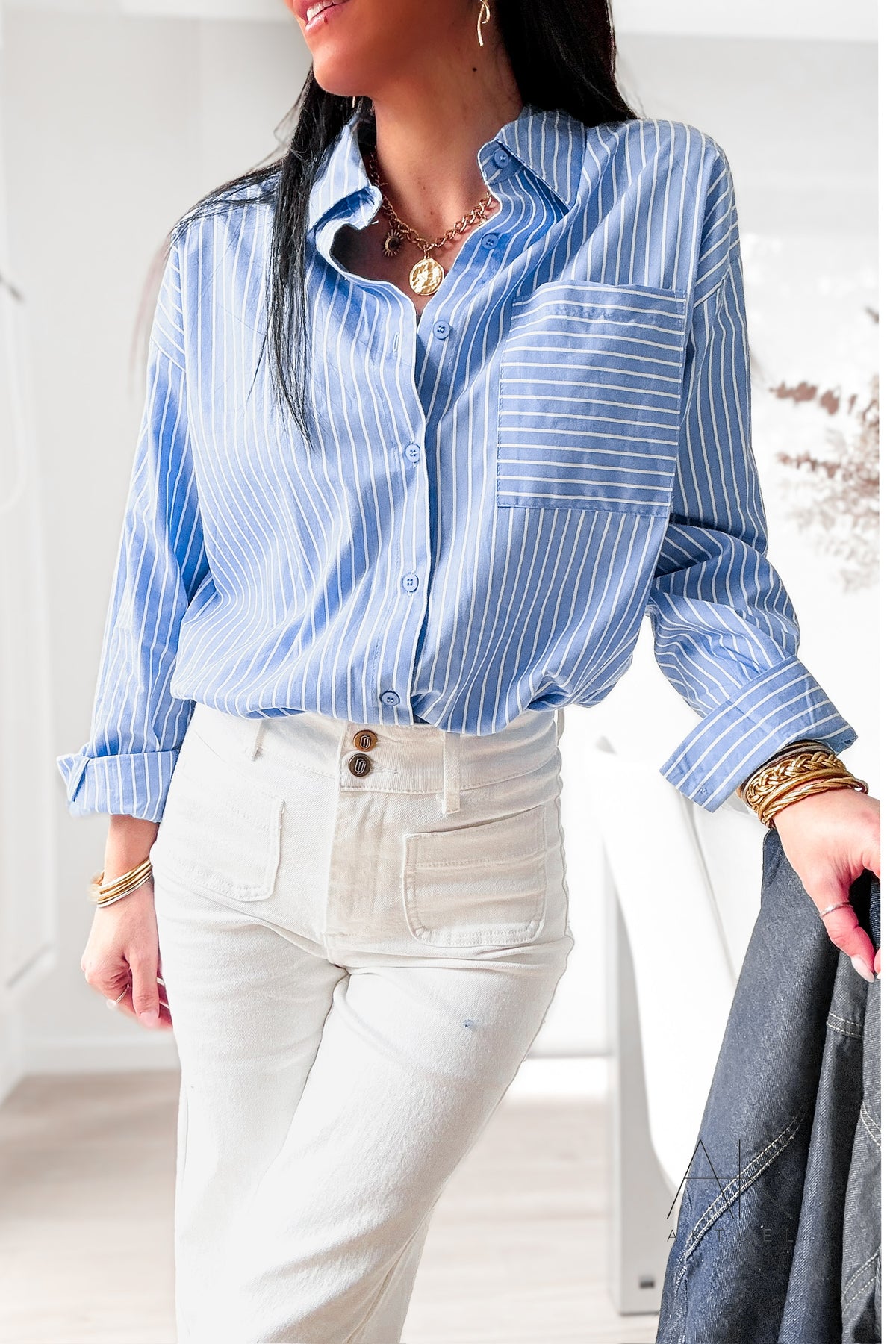 Chemise bleu ciel à rayures blanches