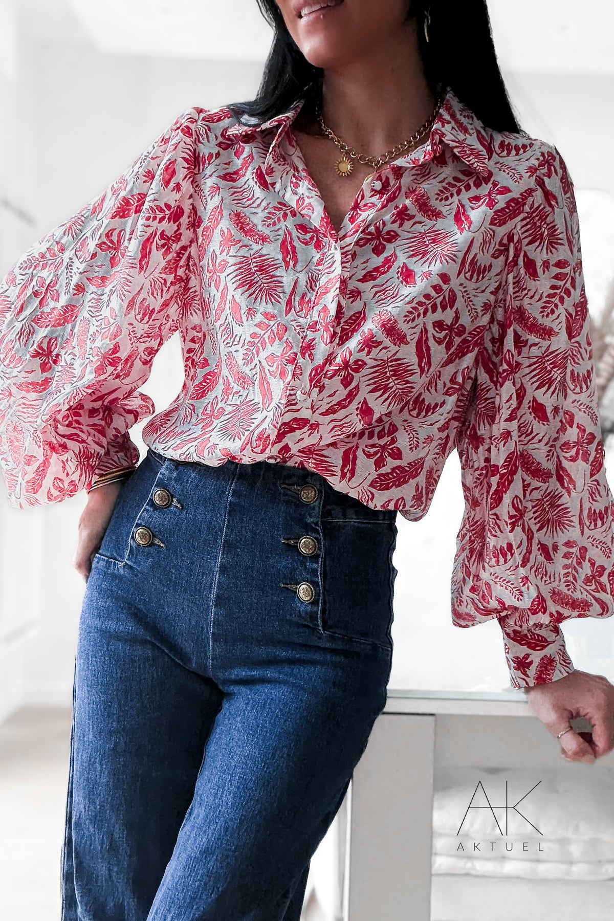 Chemise imprimé feuillage rouge et écru